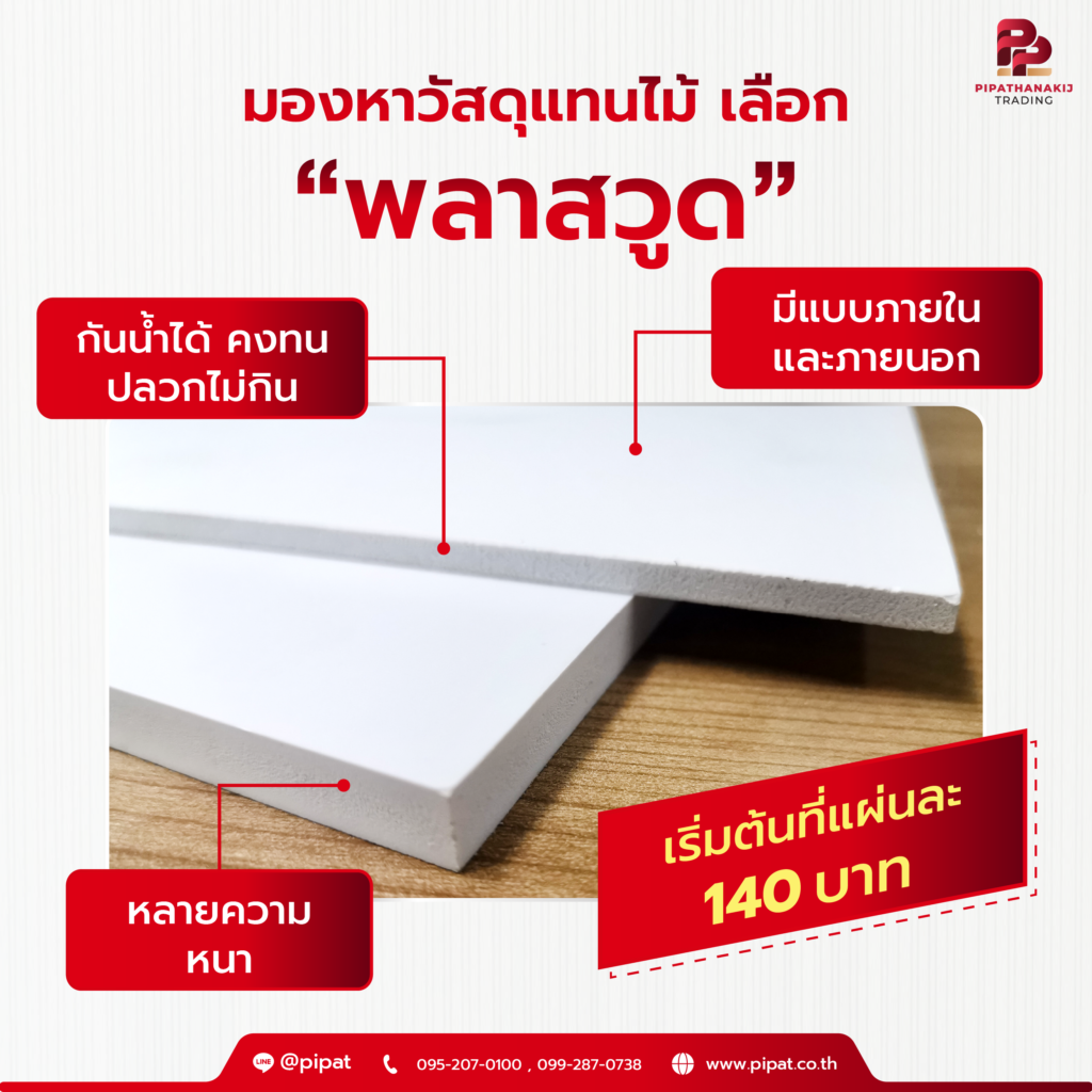 มองหา วัสดุที่ทนกว่าไม้ ปลวกไม่กิน กันน้ำได้ ไม่ติดไฟ ราคาเริ่มต้นแค่ 140 บาท🔥ต้อง “พลาสวูด”‼️ ตัวเลือกที่มีความแข็งแรง ทนทาน สวยงาม และใช้งานได้ยาวนานกว่าไม้ ทำไมสมัยนี้จึงนิยมใช้พลาสวูดแทนไม้????? ไม้ เป็นวัสดุธรรมชาติที่มีความสวยงาม แต่ราคาสูงและมีปัญหาเรื่องปลวก มอด แมลงต่างๆ มารบกวนได้ง่ายและที่สำคัญไม้ยังเป็นวัสดุที่ติดไฟได้ง่ายอีกด้วย ด้วยเหตุนี้ จึงมีการคิดค้นวัสดุสังเคราะห์ขึ้นมาทดแทนไม้ ซึ่งก็คือ “พลาสวูด” ที่ผลิตจากแผ่นพีวีซีชนิดแข็ง (PVC Foam Sheet) ที่มีคุณสมบัติเด่นคือ มีความแข็งแรง ทนทาน ไม่บวมน้ำ ไม่โก่ง ไม่งอ ไม่บิดตัว ไม่ผุกร่อน ปลวก มอด แมลงต่างๆ ไม่สามารถกัดกินได้ และที่สำคัญคือ ไม่ติดไฟ อีกทั้งยังมีอายุการใช้งานที่ยาวนานกว่าไม้ จึงช่วยให้ประหยัดค่าใช้จ่ายในการซ่อมแซมได้ในระยะยาวได้ดี ทำให้พลาสวูดเป็นวัสดุที่เหมาะสำหรับการนำมาใช้ทดแทนไม้ได้เป็นอย่างดี *เงื่อนไขเป็นไปตามที่บริษัทกำหนด (ราคายังไม่รวมภาษีมูลค่าเพิ่ม 7%) เช็คราคา สั่งซื้อ ทักเลย 📲 Line@ : https://bit.ly/3Auq1QQ (@pipat) 📝 Inbox : m.me/plastic.pipat 📞 เบอร์โทร : 095-207-0100 , 099-287